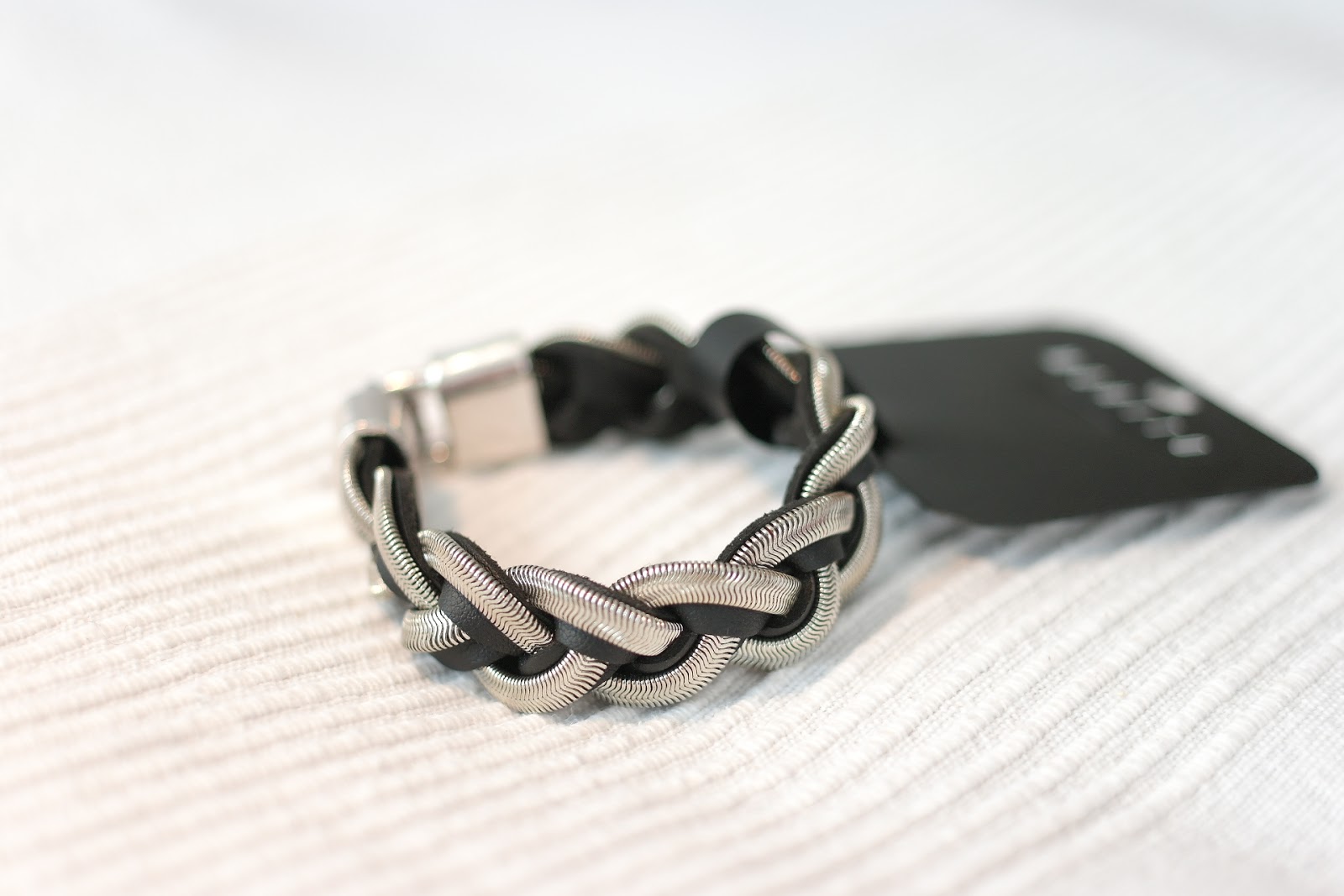 25. Bransoleta metalowa pleciona z ekoskórą, nowa