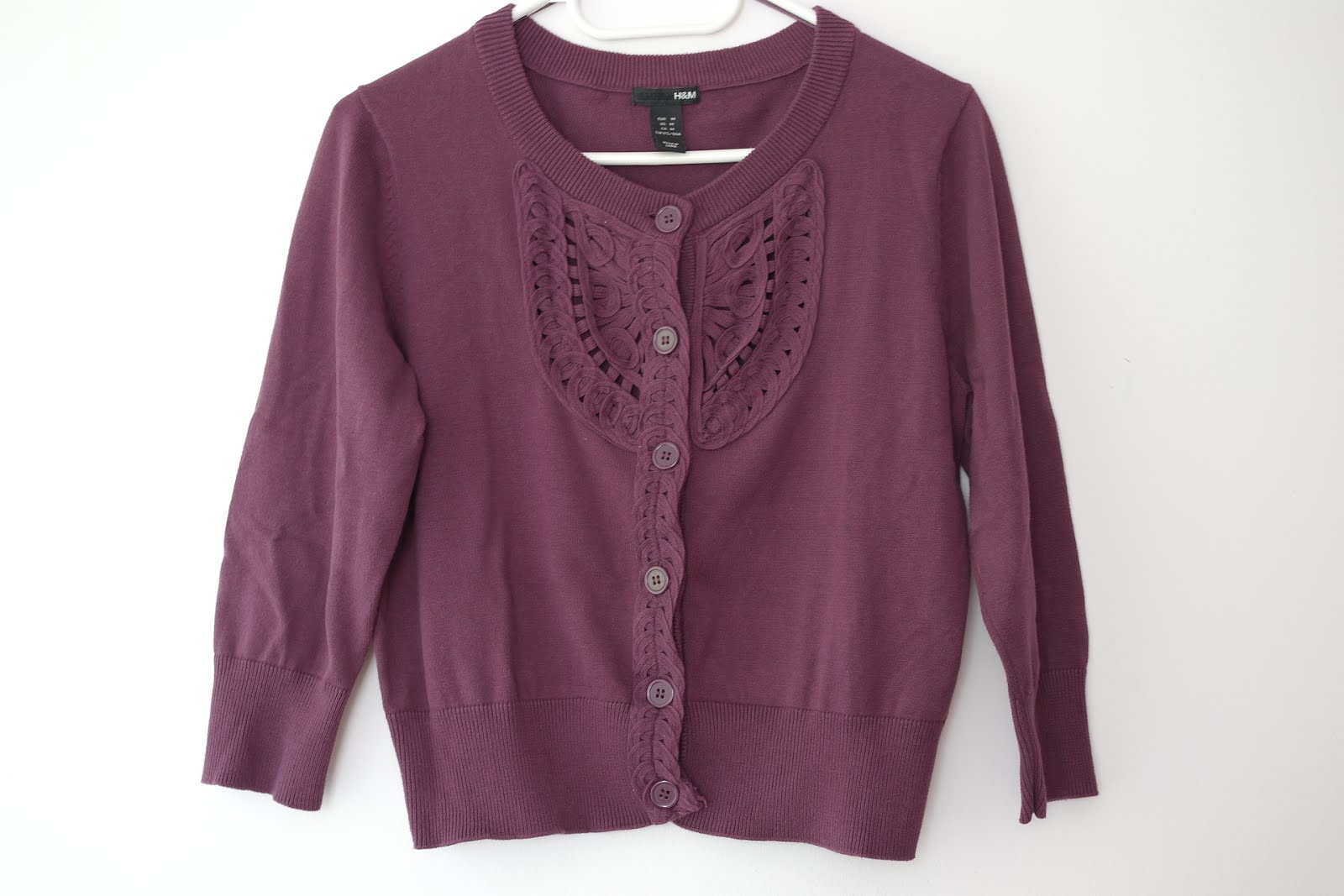 39. Krótki sweterek z ażurowym gorsem, śliwkowy, M