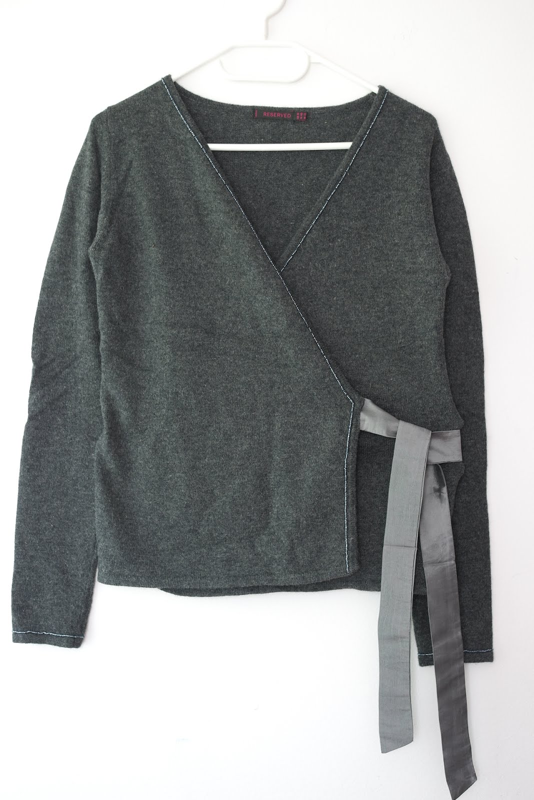 42. Wełniany, elegancki, szary sweterek kopertowy z kokardą, małe M